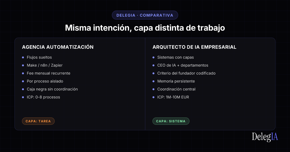 | Dimensión | Agencia de automatización | Arquitecto de IA empresarial |