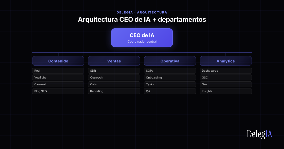 CEO de IA que es: la capa de coordinación dentro de la infraestructura de IA empresarial. No es un agente más, ni un GPT con un prompt largo, ni un flujo de Make o n8n más sofisticado. Es el componente que prioriza tareas, asigna trabajo a los departamentos de IA (Contenido, Ventas, Operativa, Analytics), revisa outputs antes de publicarlos y reporta al fundador con su criterio codificado.